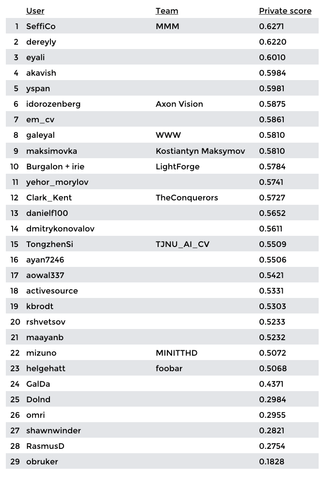 It's time to publish the private leaderboard. The final submissions of individuals / teams were graded on the private test set, yielding the following results: